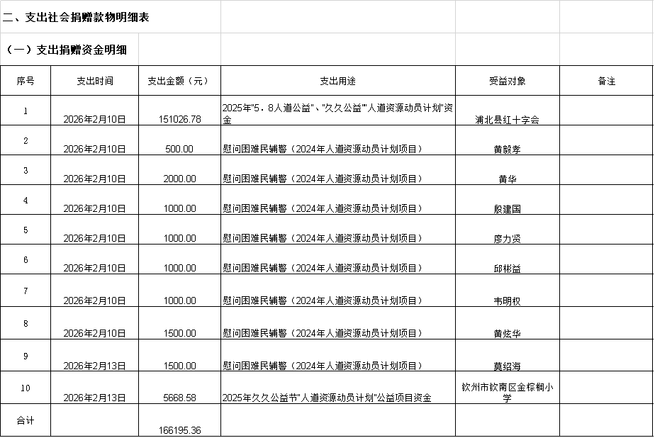 2026年2月1日至2月28日,钦州市红十字会累计支出款物共10笔166195.36元(其中支出资金10笔166195.36元)